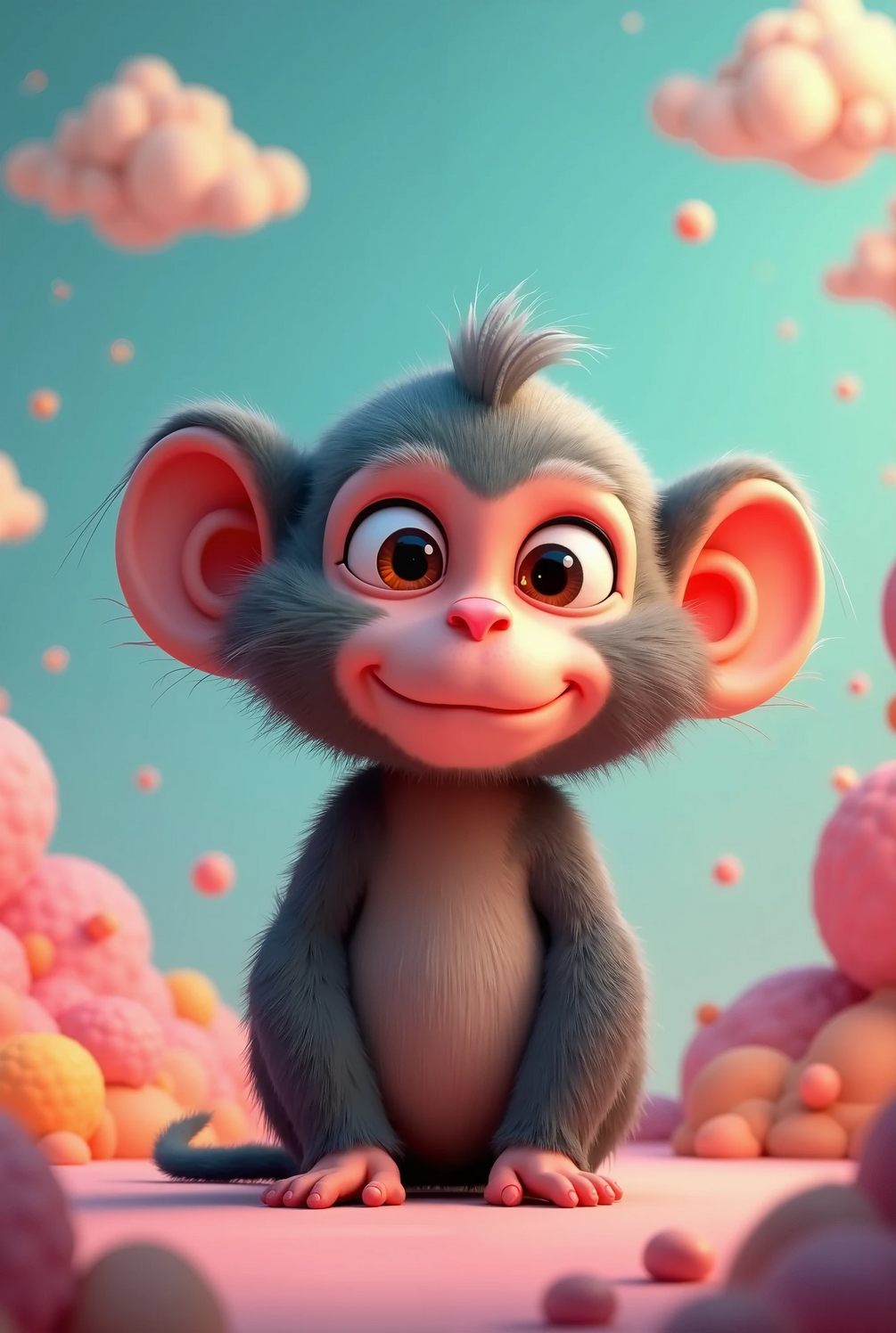 This image features a charming, cartoon-style monkey with soft, fluffy fur and big, expressive eyes. The monkey has a small, cute nose and a warm, endearing smile. Its large, round ears add to its adorable appearance. The background is a dreamy, pastel-colored landscape filled with floating, fluffy pink clouds and round, bubble-like shapes that evoke a sense of playfulness and wonder. The scene feels light and whimsical, with a surreal, fantasy-inspired atmosphere that would appeal to both children and adults.