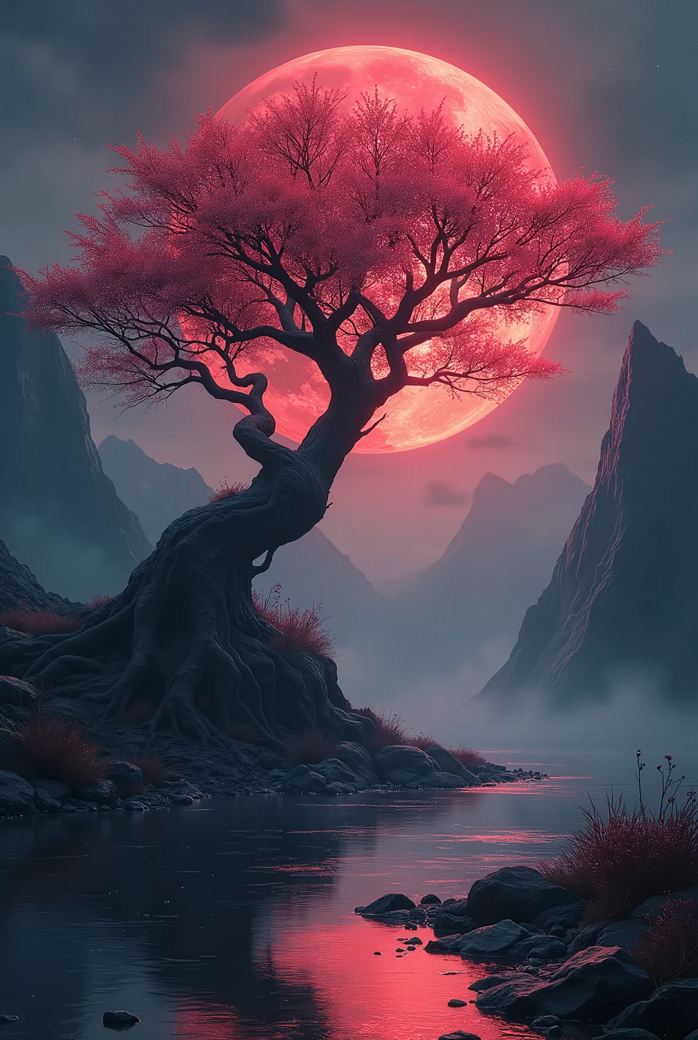 This captivating image portrays a mystical landscape bathed in the ethereal glow of a crimson moon. A lone, gnarled tree with vibrant pink foliage stands tall on a rocky promontory, its reflection shimmering in the tranquil waters below. The surrounding mountains, shrouded in mist, add to the otherworldly atmosphere. The scene evokes a sense of peace and tranquility, inviting viewers to immerse themselves in its dreamlike beauty.