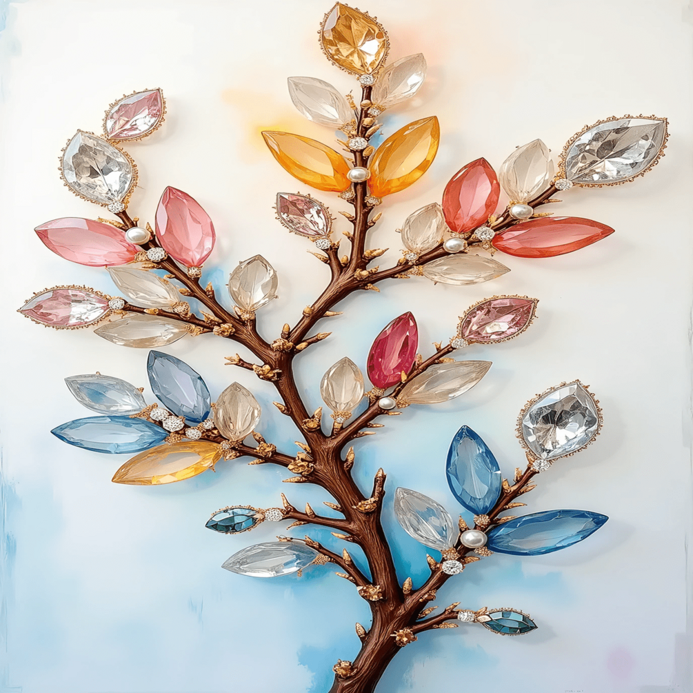 Overall, the gemstone tree image is a visually striking and potentially meaningful piece of art that showcases the artist's creativity, technical skill, and appreciation for both natural beauty and symbolic expression.
