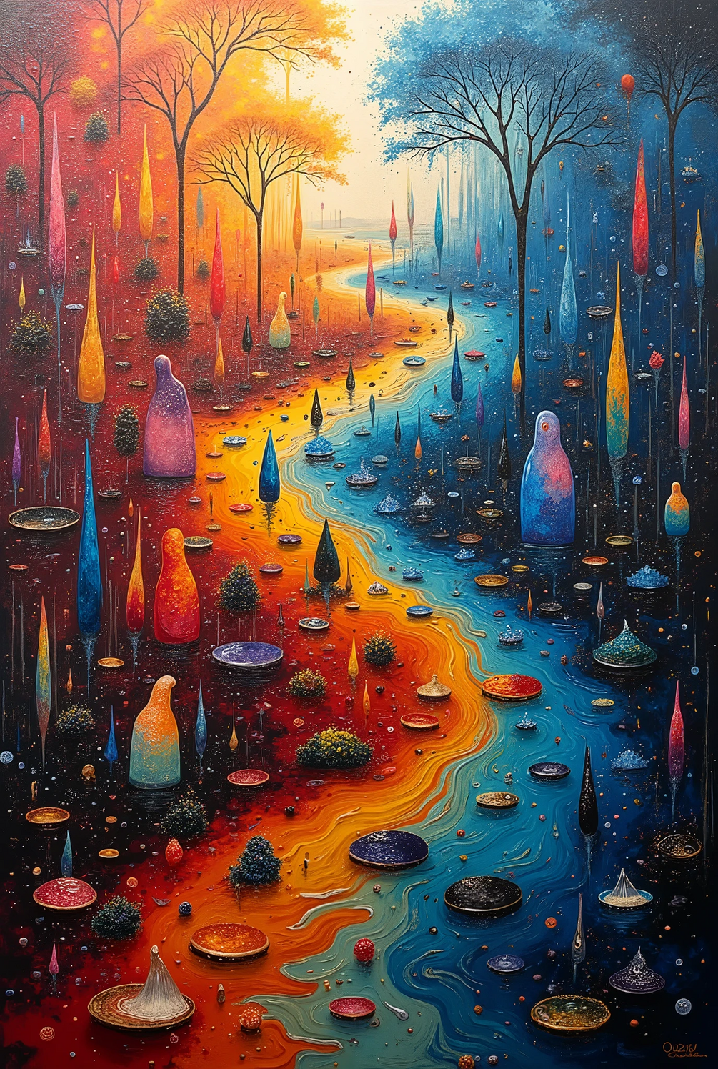 This captivating digital artwork depicts a surreal landscape divided by a vibrant river. On one side, a warm, sun-drenched forest with towering, orange-hued trees and whimsical, balloon-like figures. The opposite side presents a cooler, more ethereal scene with towering, blue-tinged trees and mysterious, elongated figures. The river itself, a shimmering band of colors, seems to flow both ways, symbolizing duality, balance, and the interconnectedness of nature.