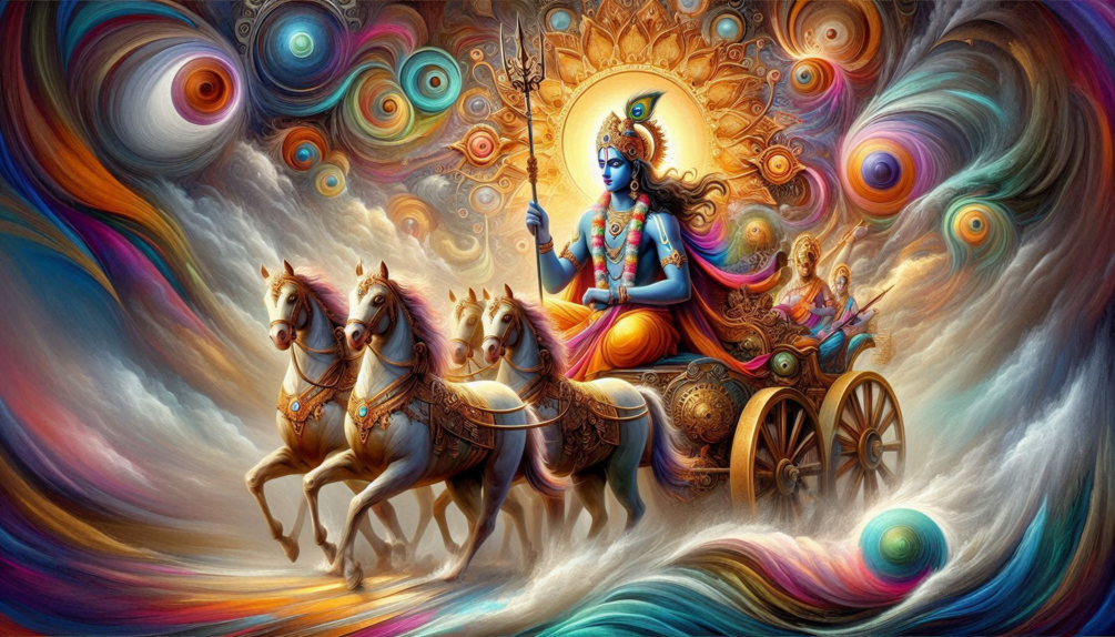 This vibrant and captivating digital artwork depicts Lord Krishna, the Supreme Being in Hindu mythology, as the charioteer of Arjuna on the battlefield of Kurukshetra. Krishna is shown in his divine form, adorned with a peacock feather crown and holding the Sudarshana Chakra. He is driving a chariot pulled by four white horses, surrounded by swirling clouds and cosmic energy. The image is a powerful representation of the Bhagavad Gita, a sacred Hindu scripture that recounts the conversation between Krishna and Arjuna on the eve of the battle.