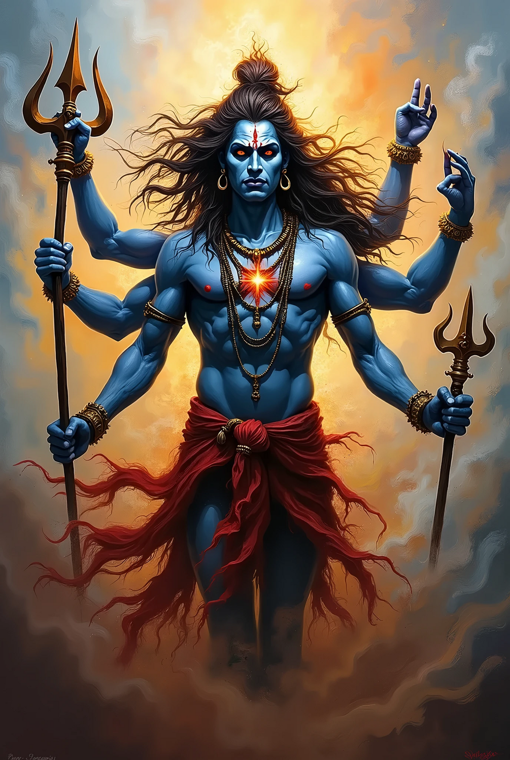 This captivating image depicts Lord Shiva, one of the most revered deities in Hinduism. With his multiple arms, each wielding a trident, Shiva exudes power and divinity. His blue skin symbolizes his cosmic nature, while the crescent moon adorning his forehead signifies his connection to time and cycles. His matted hair, often associated with asceticism and detachment, flows freely, symbolizing his renunciation of worldly desires. The third eye on his forehead, a potent weapon of destruction, represents his ability to perceive beyond the limmitations of the physical world.